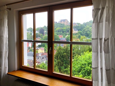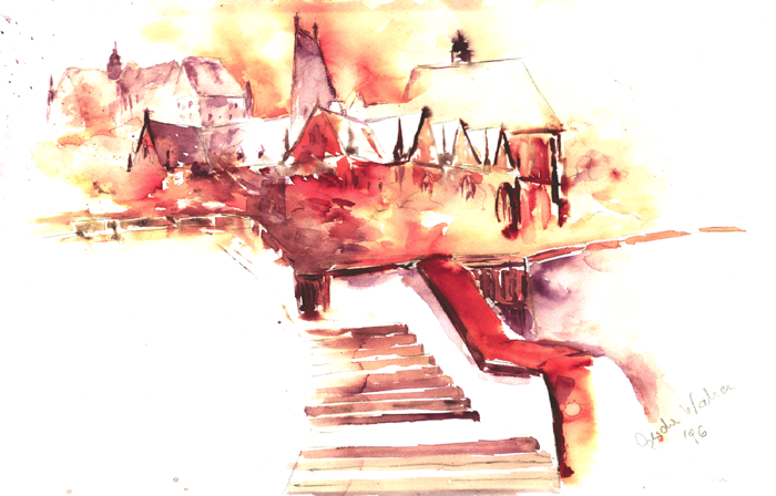 (Alte Marburger Universität mit Schloss im Hintergrund - gemalt anlässlich des Forums «Die Soziale Poesie therapeutischer Gespräche» (viisa) 1996).